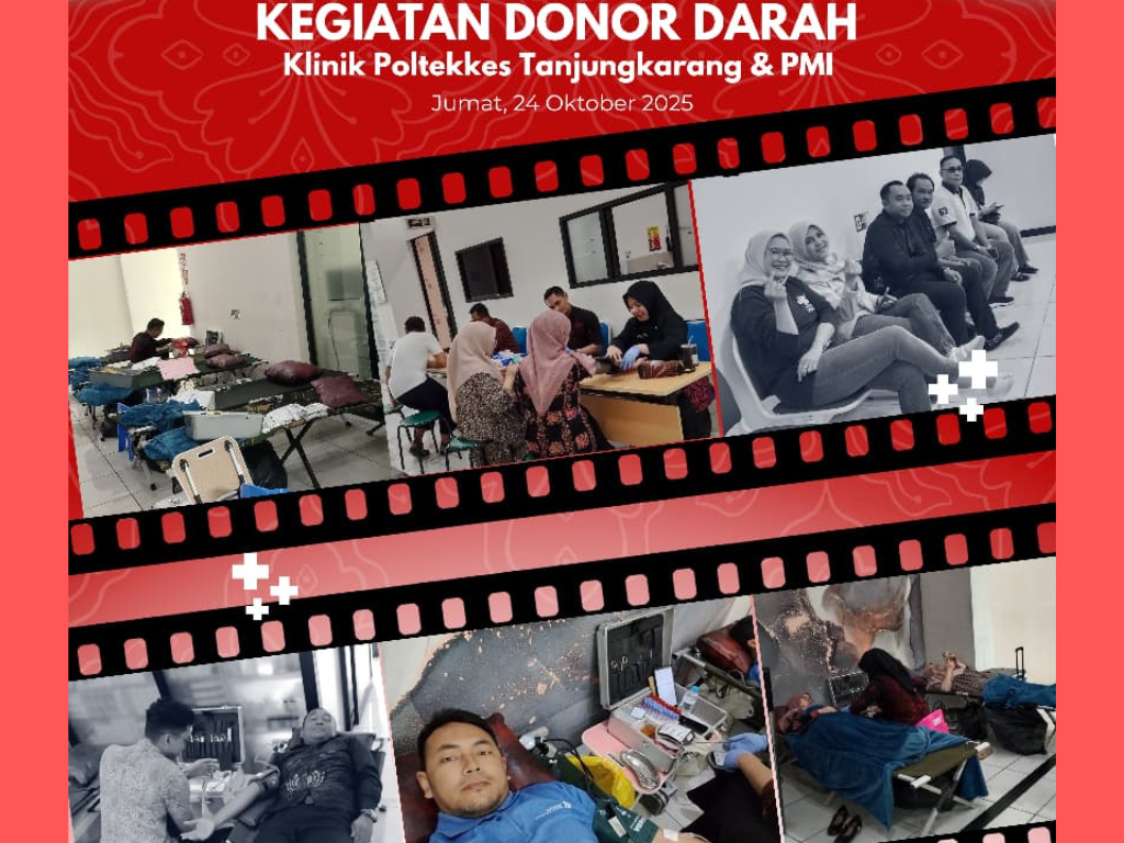 Alhamdulillah, kegiatan Donor Darah yang diselenggarakan oleh Poltekkes Kemenkes Tanjungkarang melalui Klinik Pratama Poltekkes Tanjungkarang bekerja sama dengan PMI Provinsi Lampung, pada Jumat, 24 Oktober 2025, telah berjalan lancar