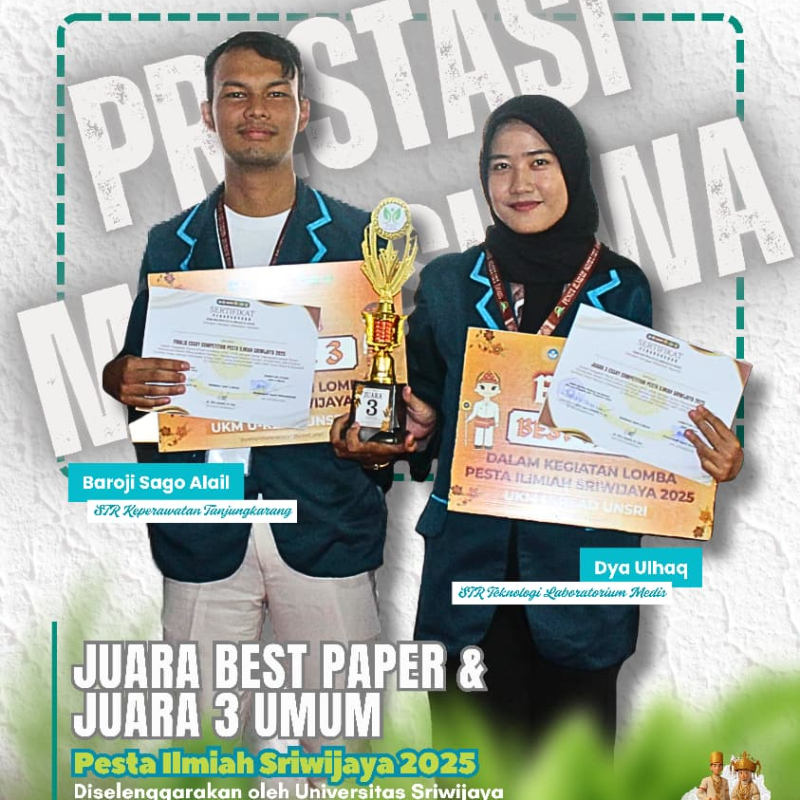 Salsabila Dya Ulhaq (Prodi STr Teknologi Laboratorium Medis) dan Baroji Sago Alail (Prodi Keperawatan Tanjungkarang) yang telah berhasil meraih dua kategori juara pada Lomba Esai Nasional Universitas Sriwijaya (UNSRI), yaitu: